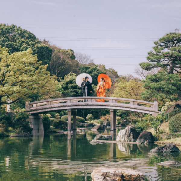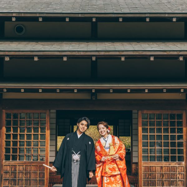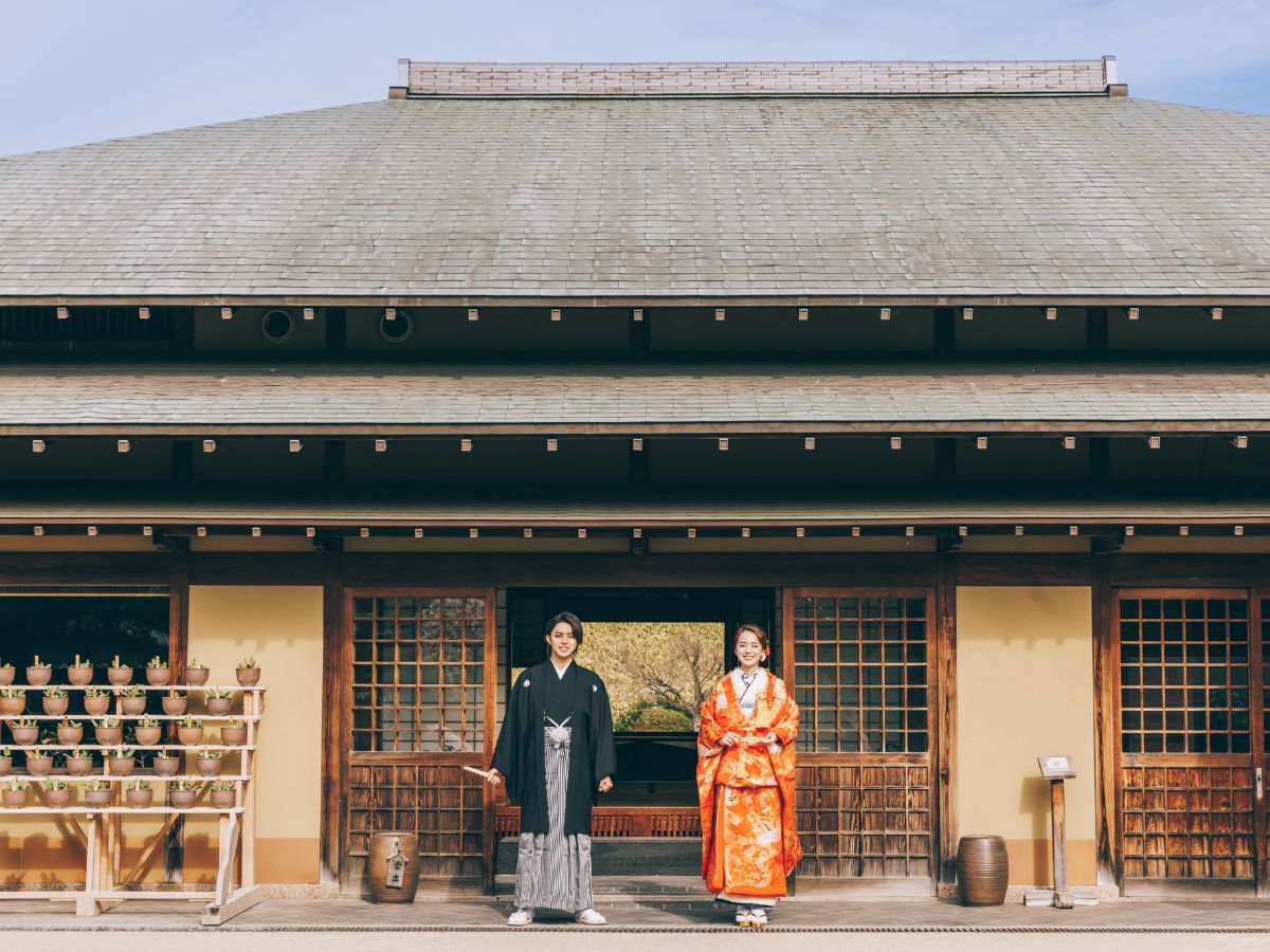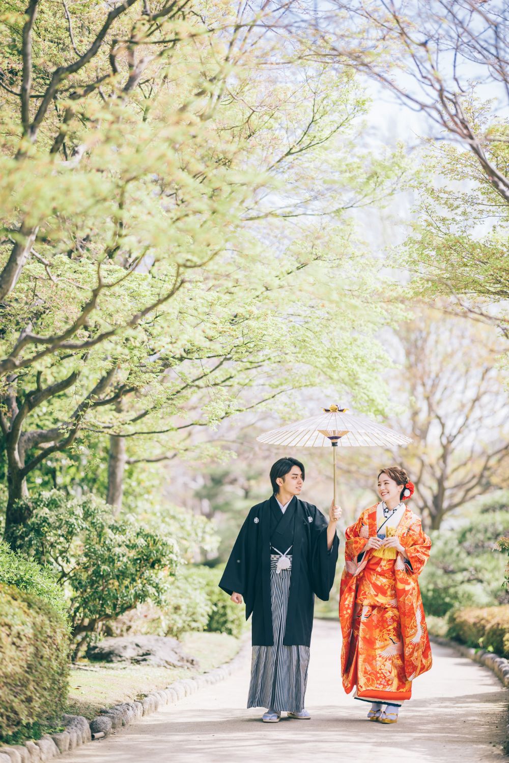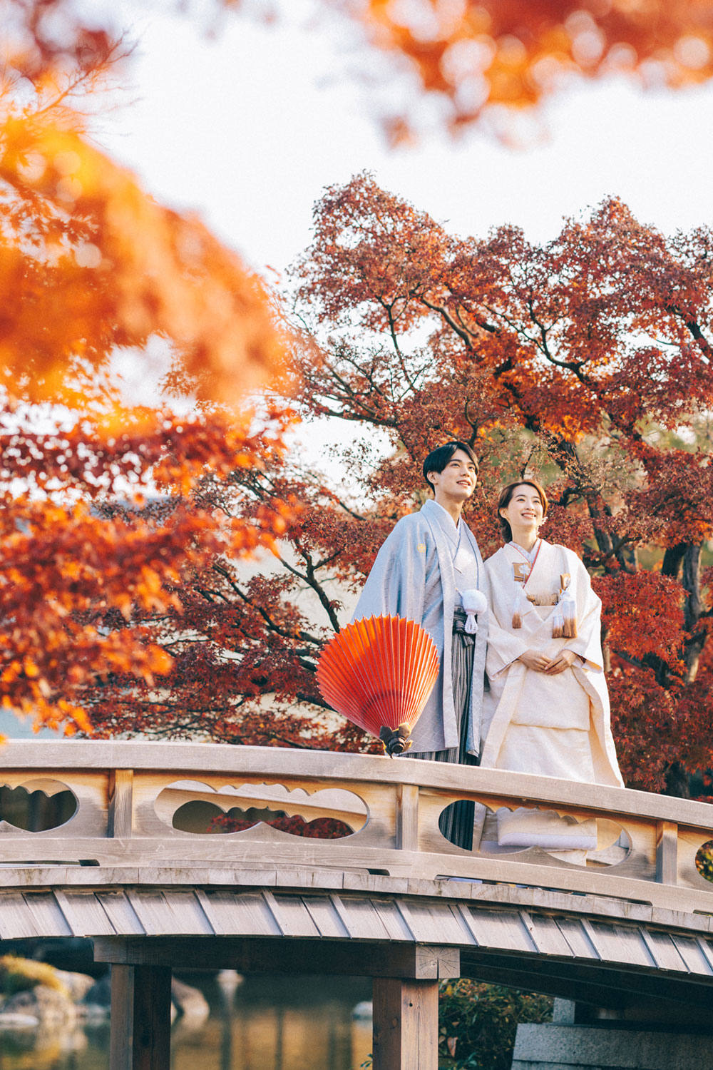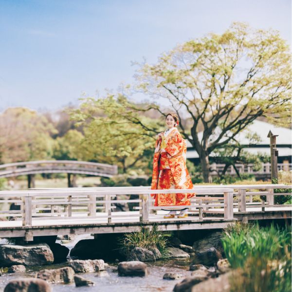 26,000平方メートルの敷地に造り込まれた庭園で撮影する和装前撮りは日本情緒溢れる仕上がりに。
