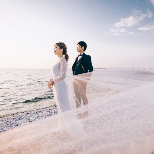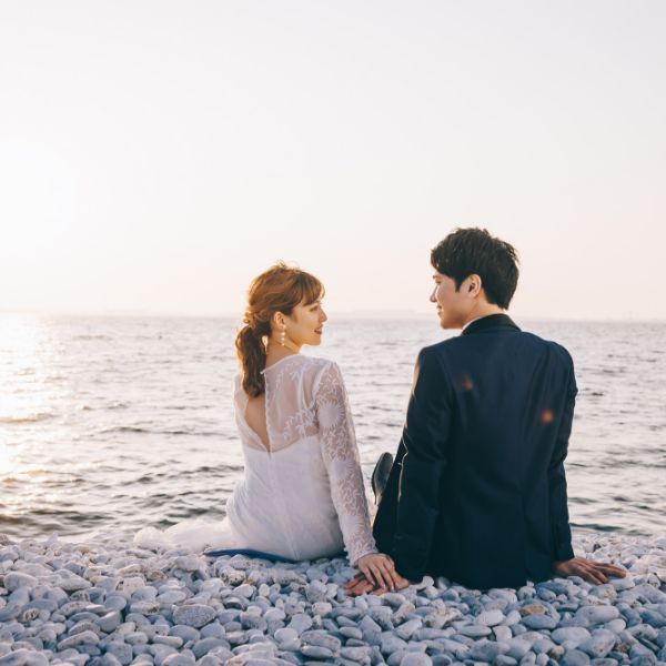 オレンジ色の夕焼けに浮かぶお二人の美しいシルエット写真を残せます。