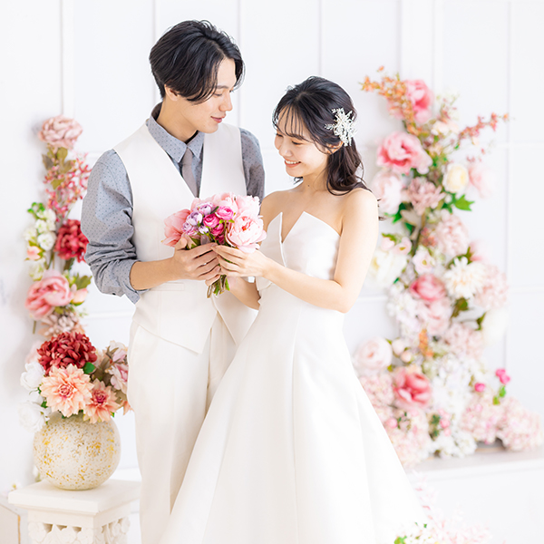 チャペルや日本庭園で残す、お洒落なウェディングフォト。スタジオだから、天気や季節を気にせず撮影をお楽しみいただけます。