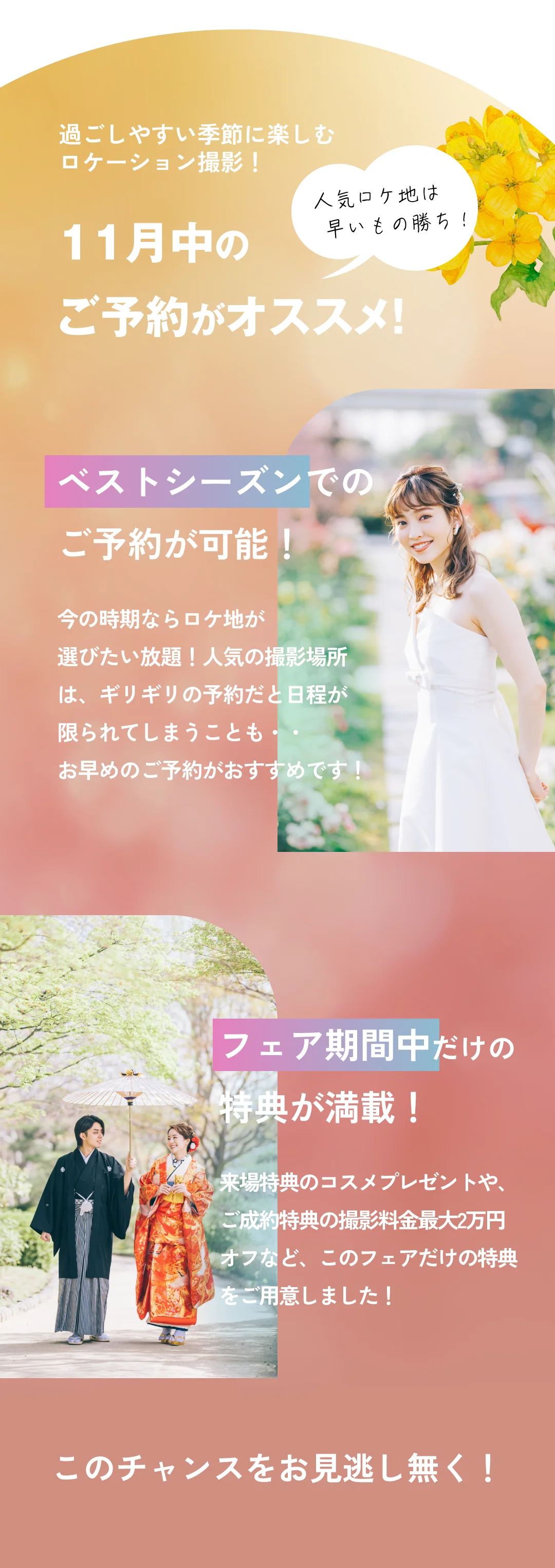 季節の空気を感じながら残す、お洒落なウェディングフォト。ロケーションに特化したカメラマンがお二人の素敵な表情を写真に残します。