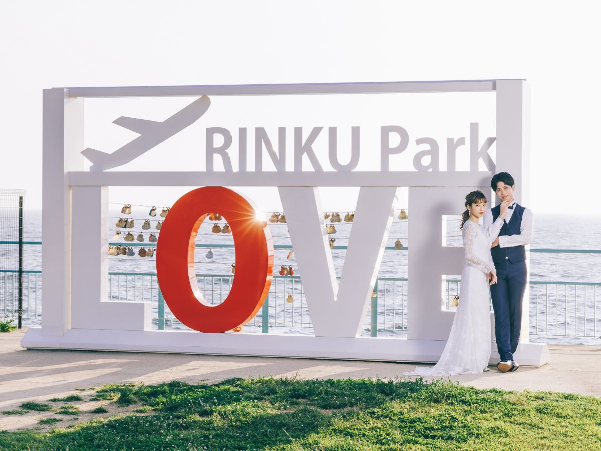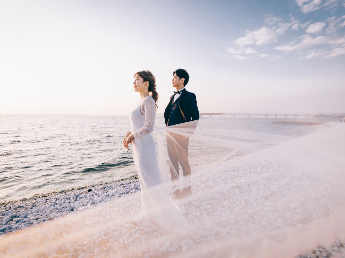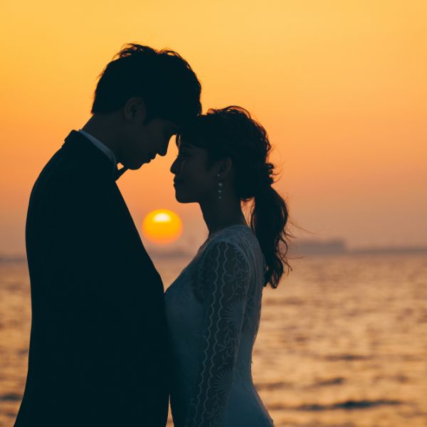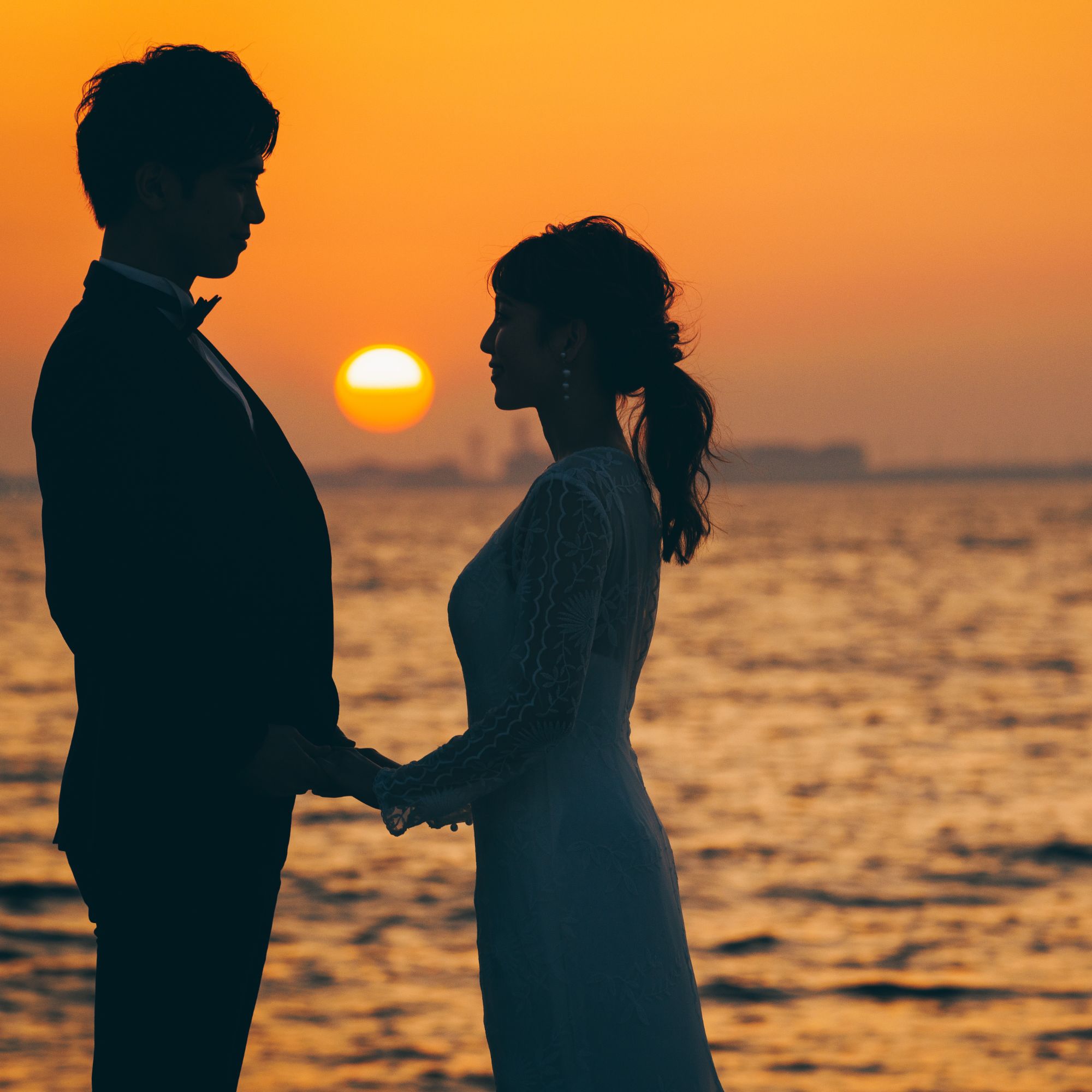 オレンジ色の夕焼けに浮かぶお二人の美しいシルエット写真を残せます。