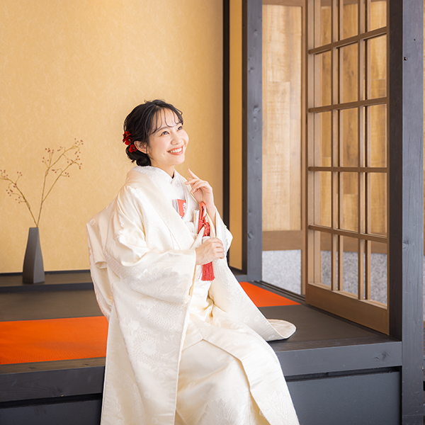 お二人のヘアメイクと着付けが完成したらスタジオへ移動します。ウェディングフォトに特化したカメラマンがお二人の素敵な表情を写真に残します。