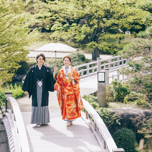 26,000平方メートルの敷地に造り込まれた庭園で撮影する和装前撮りは日本情緒溢れる仕上がりに。※別途申請料あり