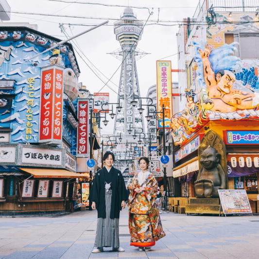 衣装と撮影、約150カットの全カットデータなどがついたお得なロケーションフォトプラン。有名な大阪の下町『新世界』。映画やドラマの舞台となっている風情ある街並みは粋なお二人のストリートフォトにぴったり。※別途申請料あり
