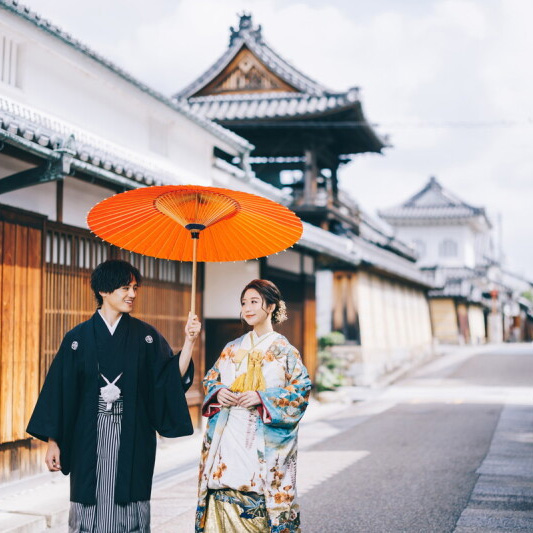 衣装と撮影、約150カットの全カットデータなどがついたお得なロケーションフォトプラン。江戸時代~昭和初期の街並みが残る風景に、伝統の和装で佇むお二人。しっとりと情緒ある写真を残していただけます。※別途申請料あり