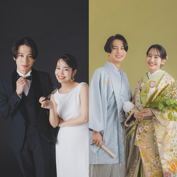 ドレスと和装でたっぷり撮影!紅葉や桜が彩る屋内庭園での写真や、白背景の結婚写真らしいお二人の姿が残せるスタジオフォトプランです。多彩な衣装コレクションから和装1着・洋装1着の2つのコーディネートで撮影をお楽しみいただけます。