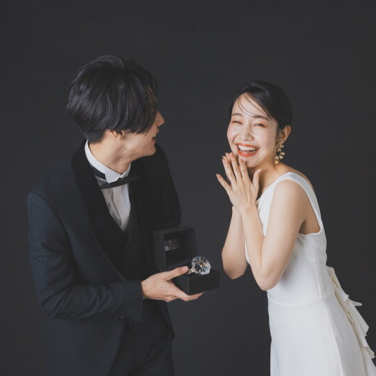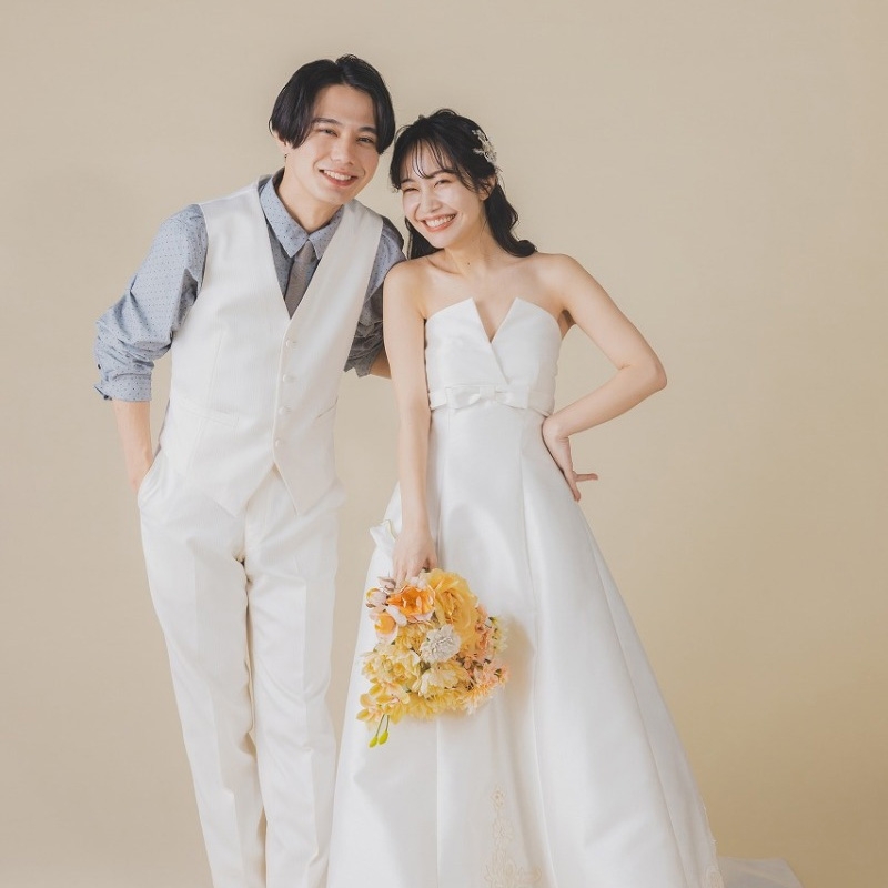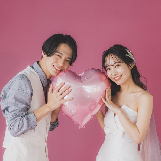 チャペルで結婚式さながらの写真や、白背景の結婚写真らしいお二人の姿が残せるスタジオフォトプランです。衣装と撮影データなど、撮影に必要なものがフルセットになったお得なプラン!