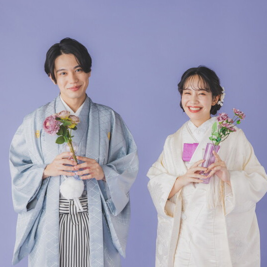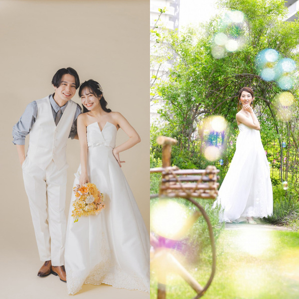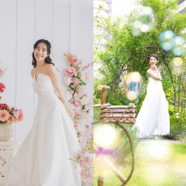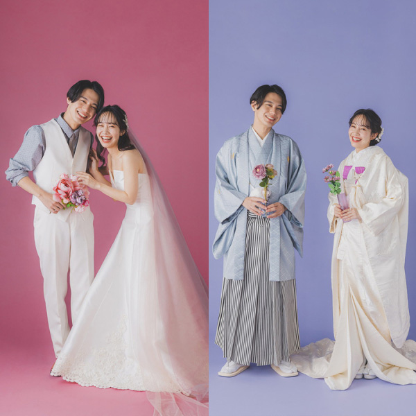 ドレスと和装でたっぷり撮影!紅葉や桜が彩る屋内庭園での写真や、白背景の結婚写真らしいお二人の姿が残せるスタジオフォトプランです。多彩な衣装コレクションから和装1着・洋装1着の2つのコーディネートで撮影をお楽しみいただけます。