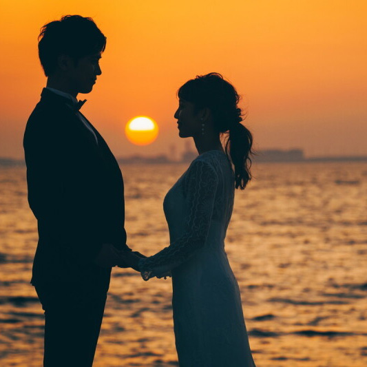 衣装と撮影、約150カットの全カットデータなどがついたお得なロケーションフォトプラン。白い大理石が敷き詰められた900mのロングビーチで夕焼けに浮かぶお二人の美しいシルエット写真を残せます。