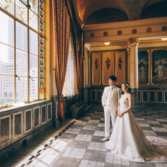 衣装と撮影、約150カットの全カットデータなどがついたお得なロケーションフォトプラン。ネオルネッサンス様式の外観、光溢れるステンドグラスなど目に映る全てが美しい中央公会堂でお二人らしく輝く写真を。※別途申請料あり