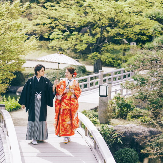 26,000平方メートルの敷地に造り込まれた庭園で撮影する和装前撮りは日本情緒溢れる仕上がりに。※別途申請料あり
