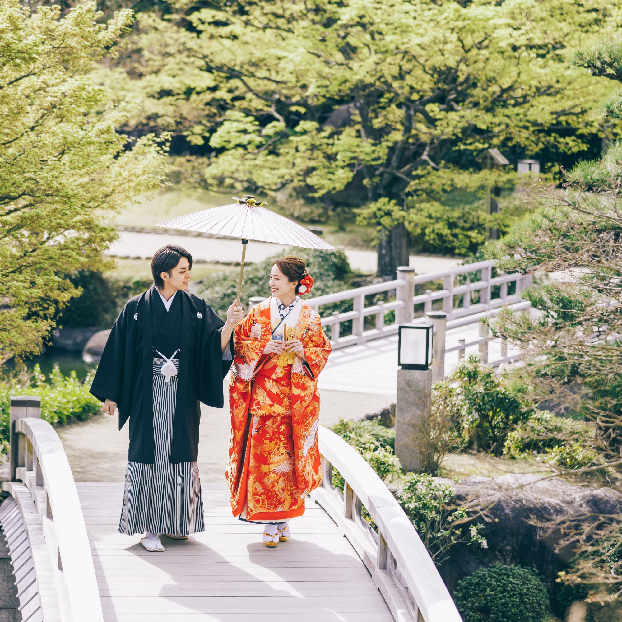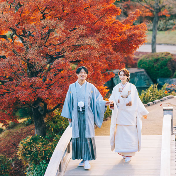 26,000平方メートルの敷地に造り込まれた庭園で撮影する和装前撮りは日本情緒溢れる仕上がりに。