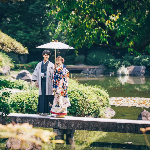 近代造園のスタイルを確立したと称えられる造園家が手掛けた純日本風の林泉回遊式庭園は、和装前撮りにぴったりです。