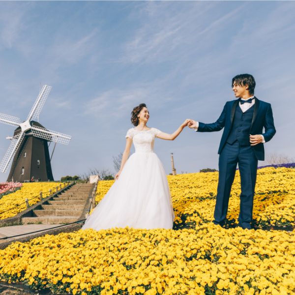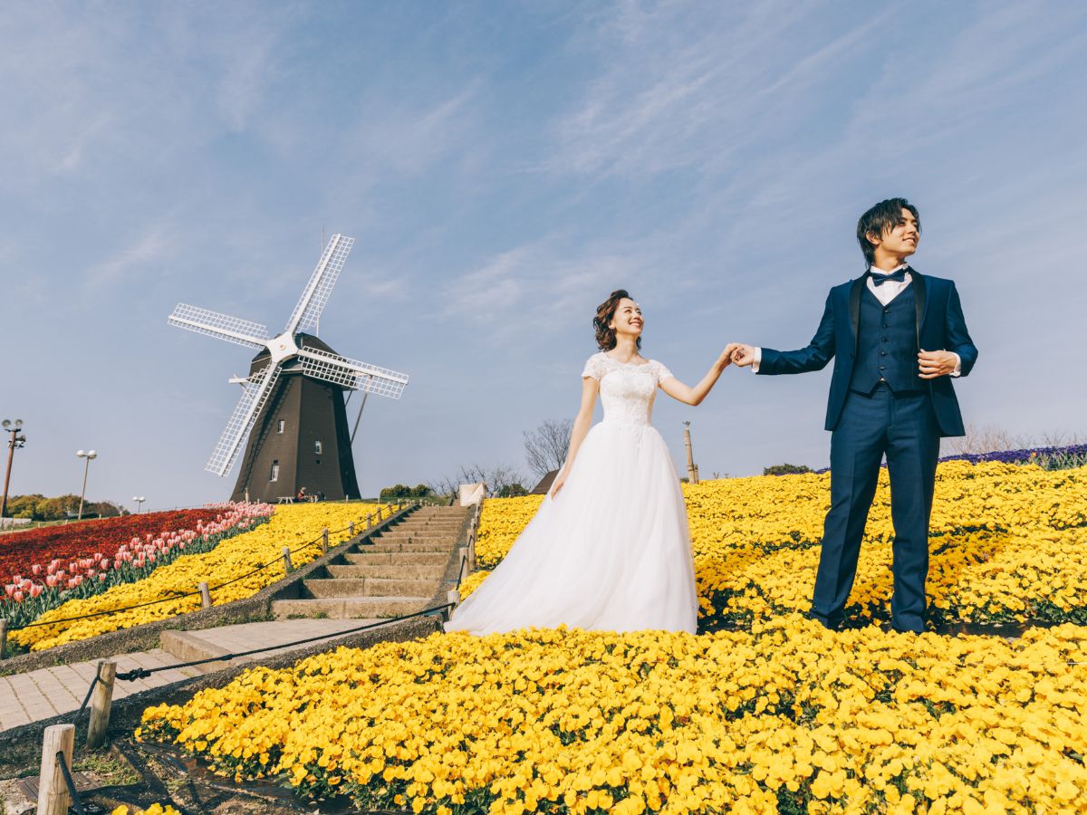 園内には、花畑や風車があり、他にはない美しい景観がウェディングドレスとぴったり。